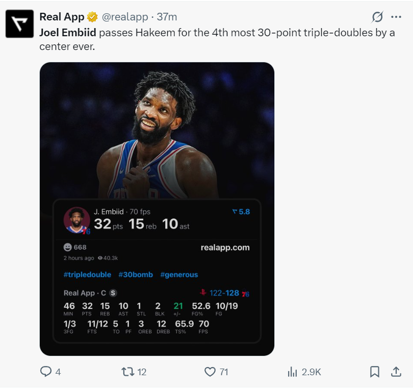 恩比德鏖战45分36秒赛季新高,拿到32分15篮板10助攻1抢断1盖帽5失误,命中率52.6%,三分命中率33.3%,罚球12中11。